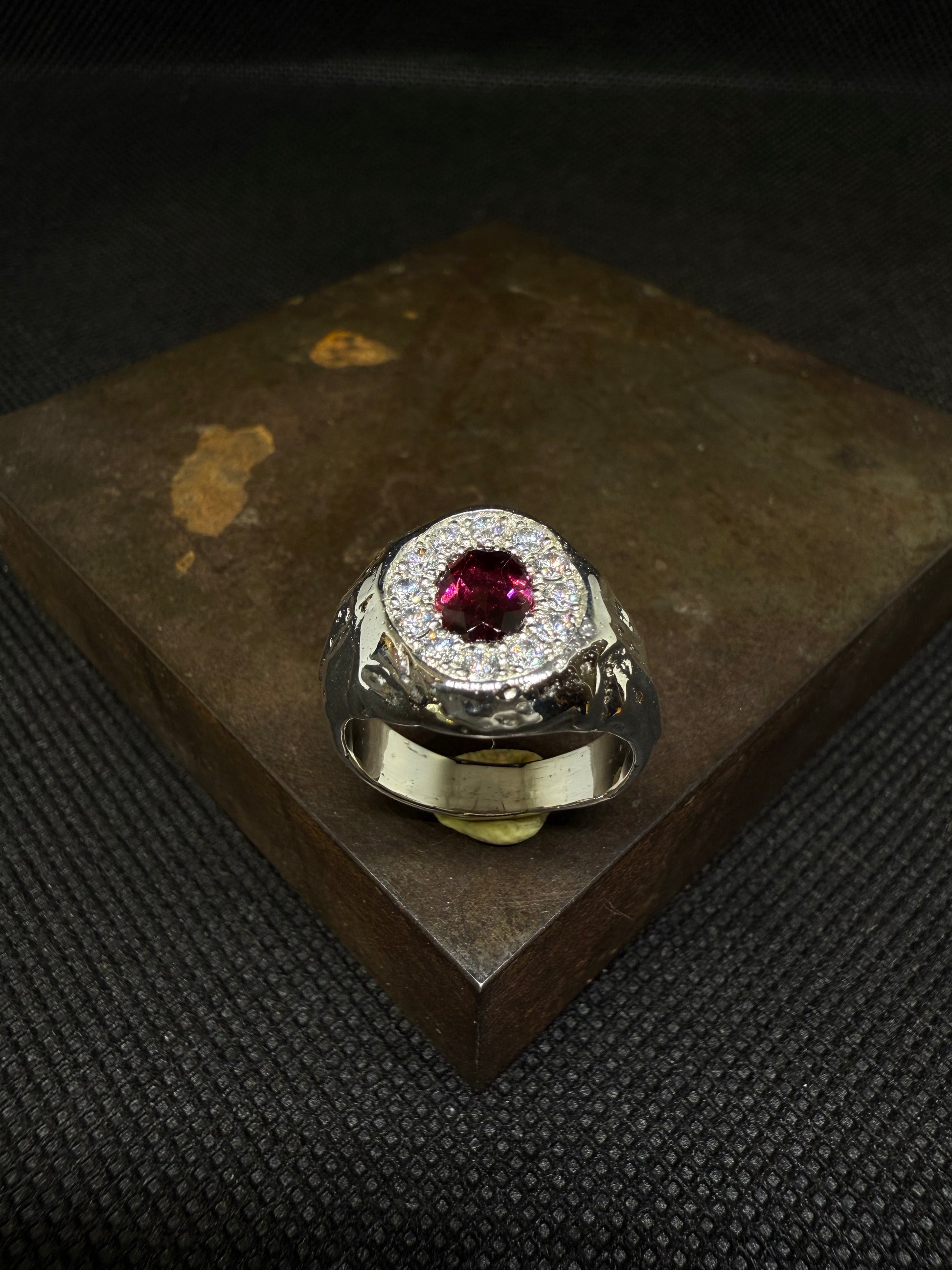 En son centre trône un Grenat ovale d’un rouge profond, captivant par son éclat et son intensité. Cette pierre centrale est mise en valeur par un entourage d’oxydes de zirconium étincelants, formant un contraste lumineux et raffiné.