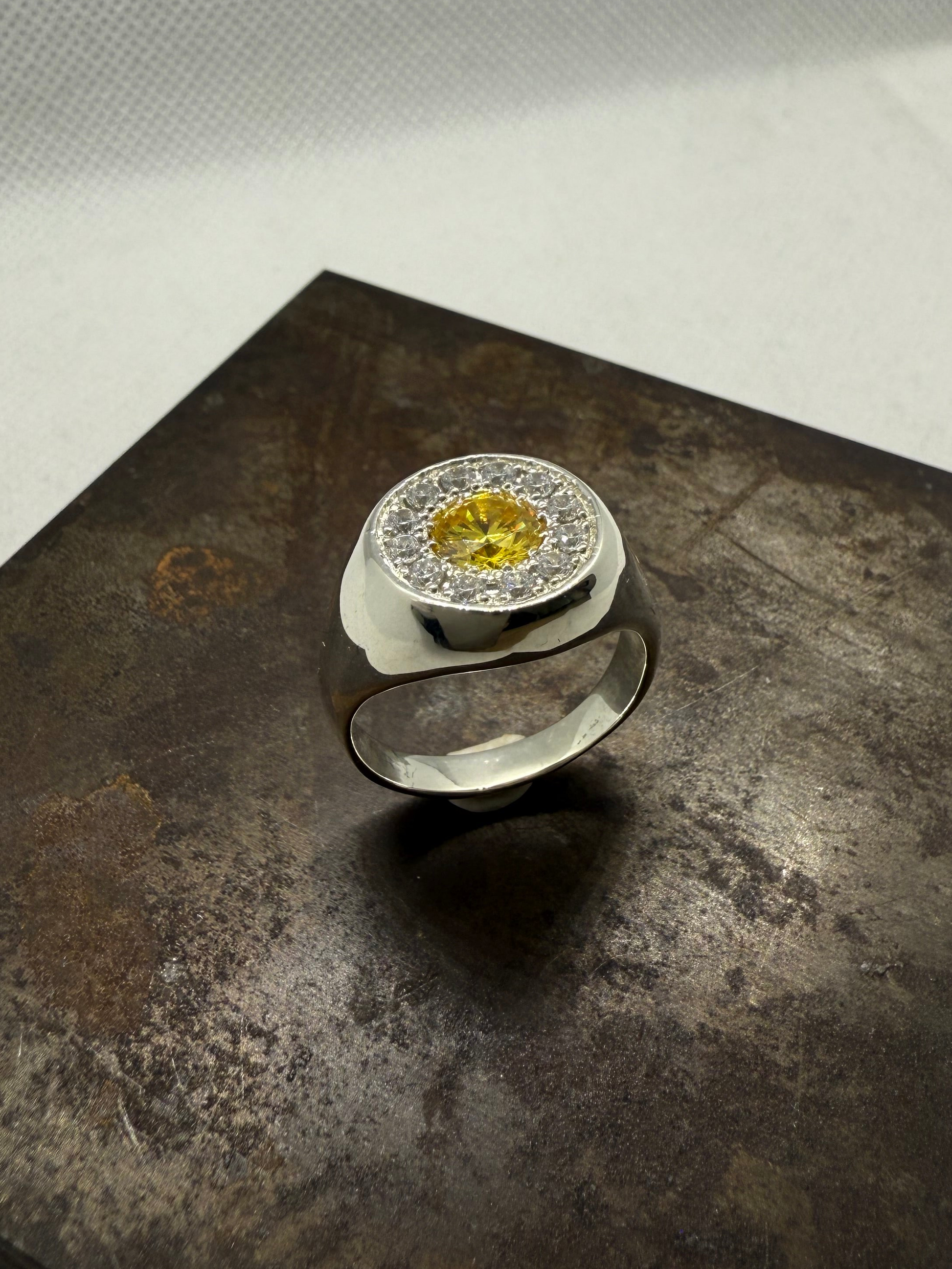 Sublimez votre style avec cette chevalière élégante et moderne, mettant en valeur un somptueux oxyde de zirconium Jaune au centre. La pierre principale est sublimée par un entourage d’oxydes de zirconium blancs soigneusement sertis , créant un jeu d’éclat raffiné et intemporel.