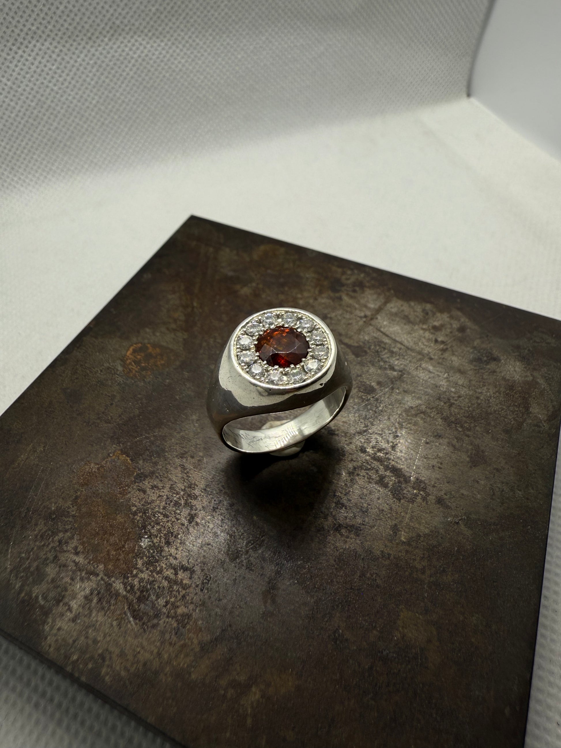 Le tout est serti sur un corps en argent massif poli, au design sobre et élégant, garantissant confort et durabilité.