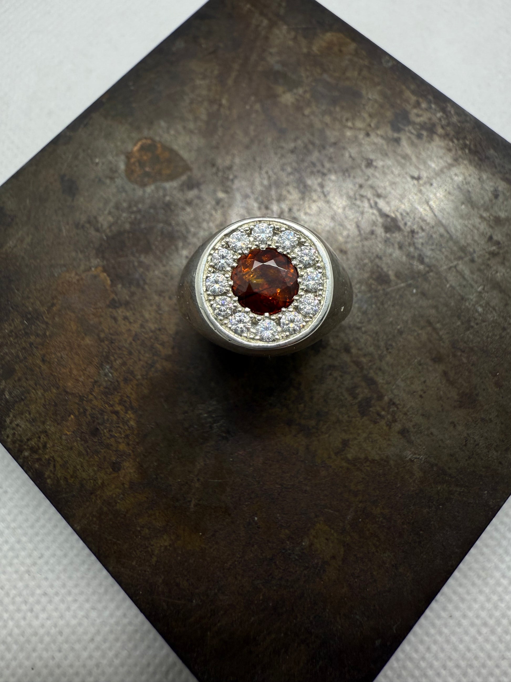 Au centre trône une magnifique Sphène aux reflets ambrés et flamboyants, une pierre rare connue pour sa brillance exceptionnelle et son feu multicolore rivalisant avec celui du diamant.