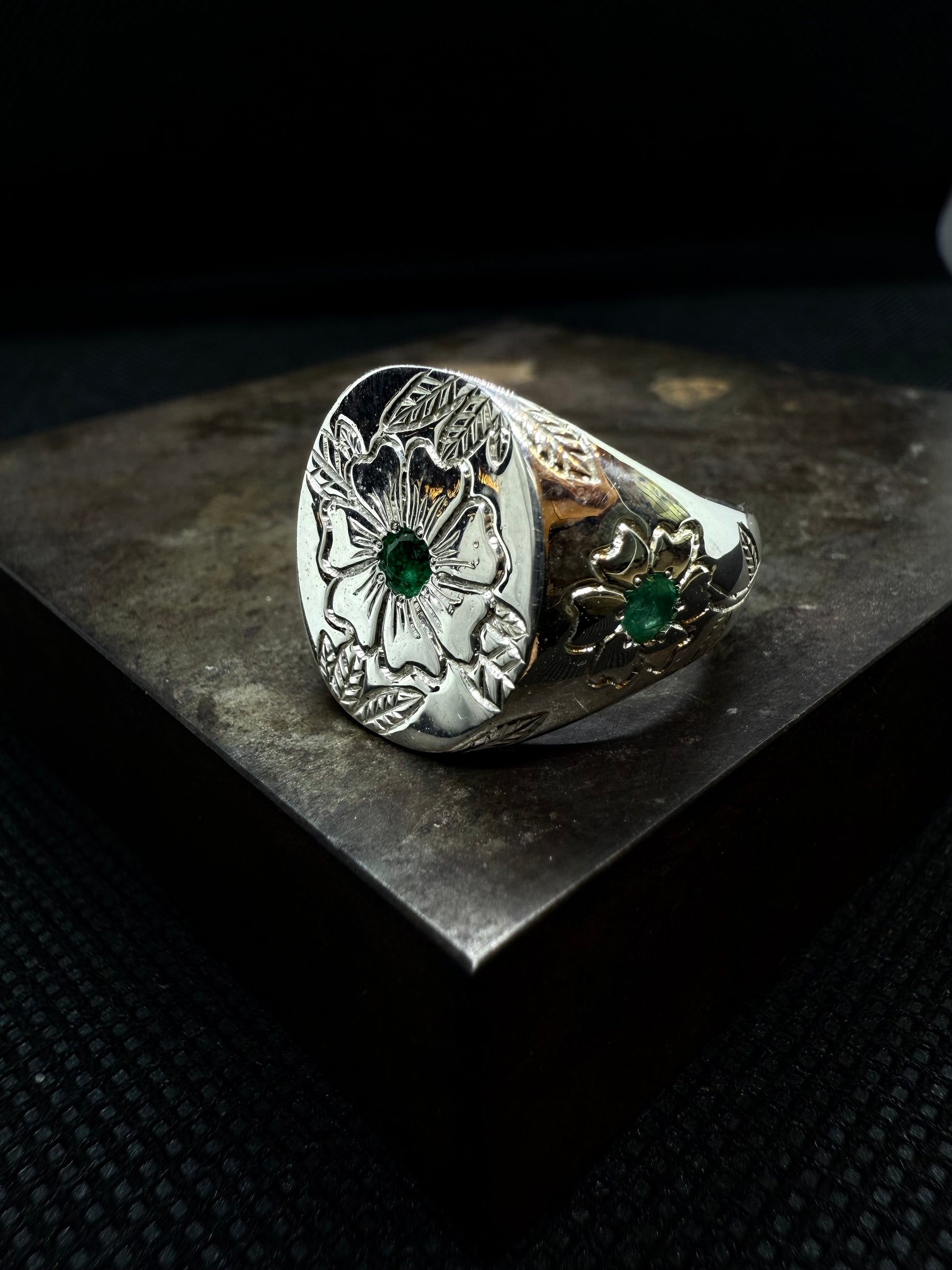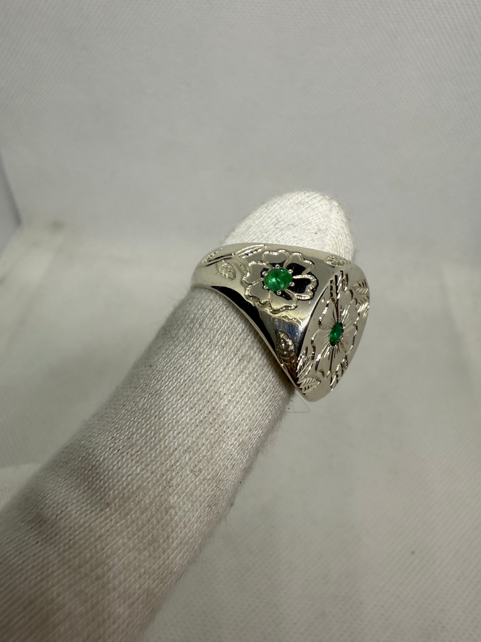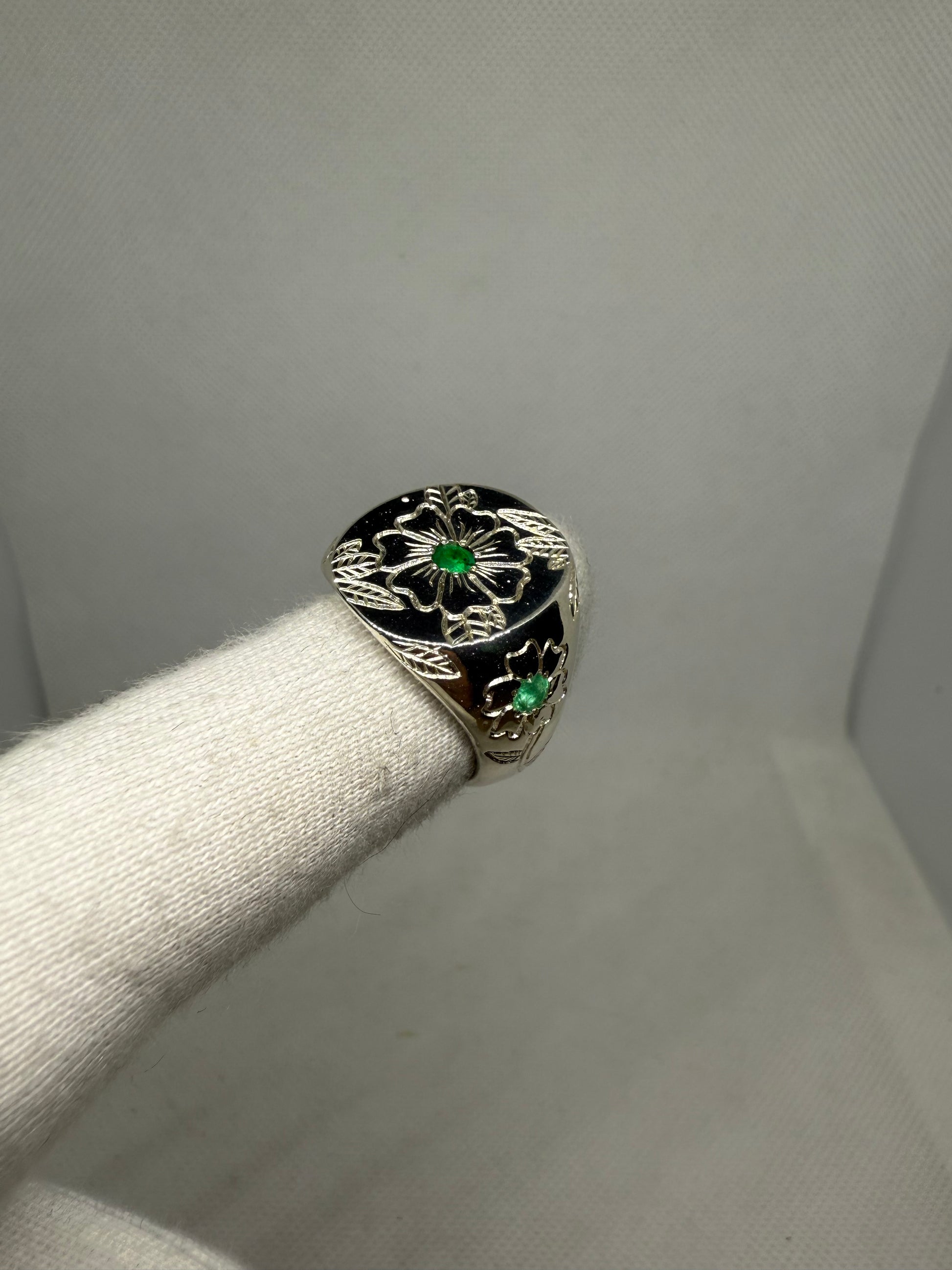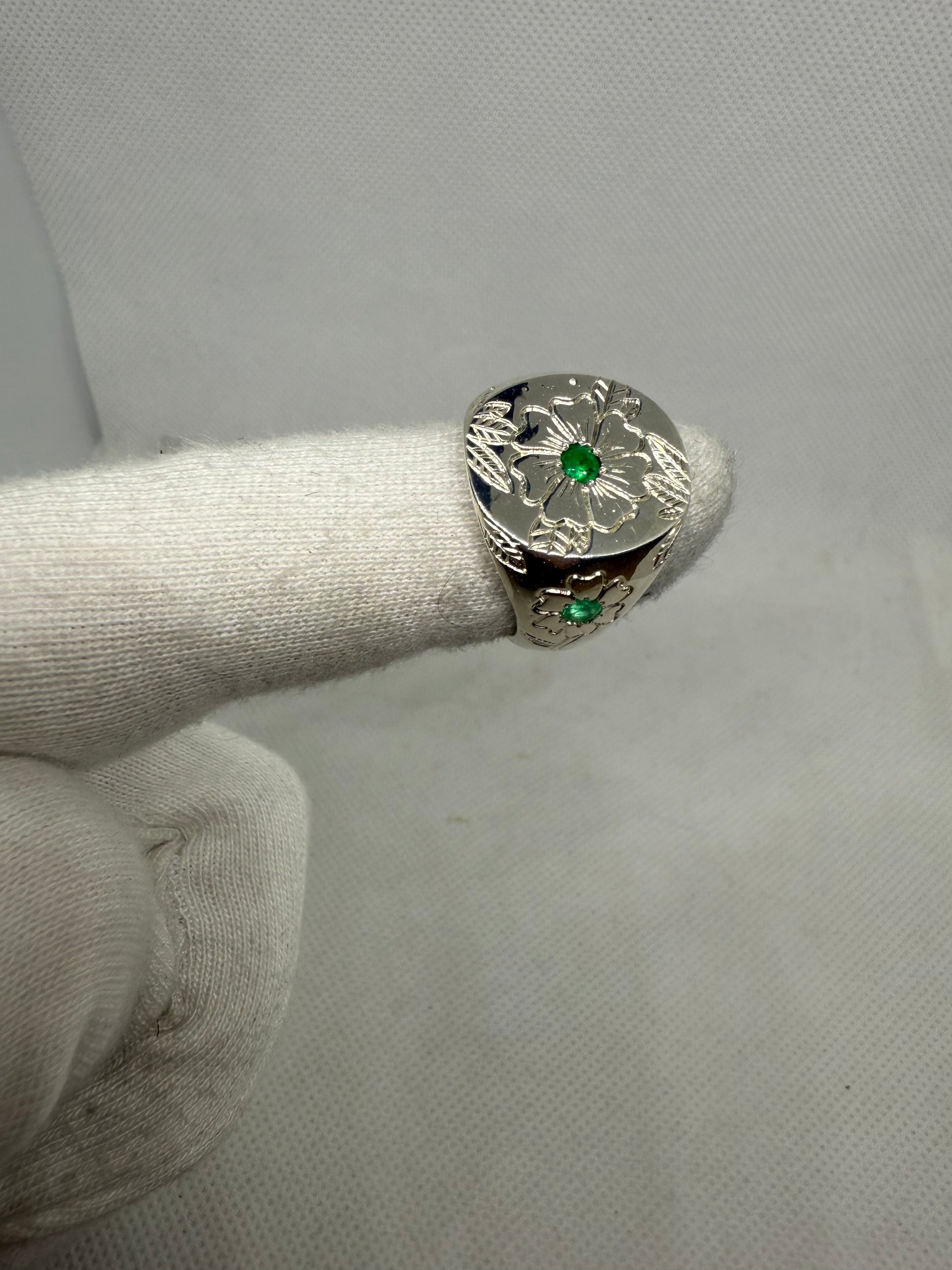 ✨Chevalière en argent massif gravée à la main – Émeraudes naturelles✨