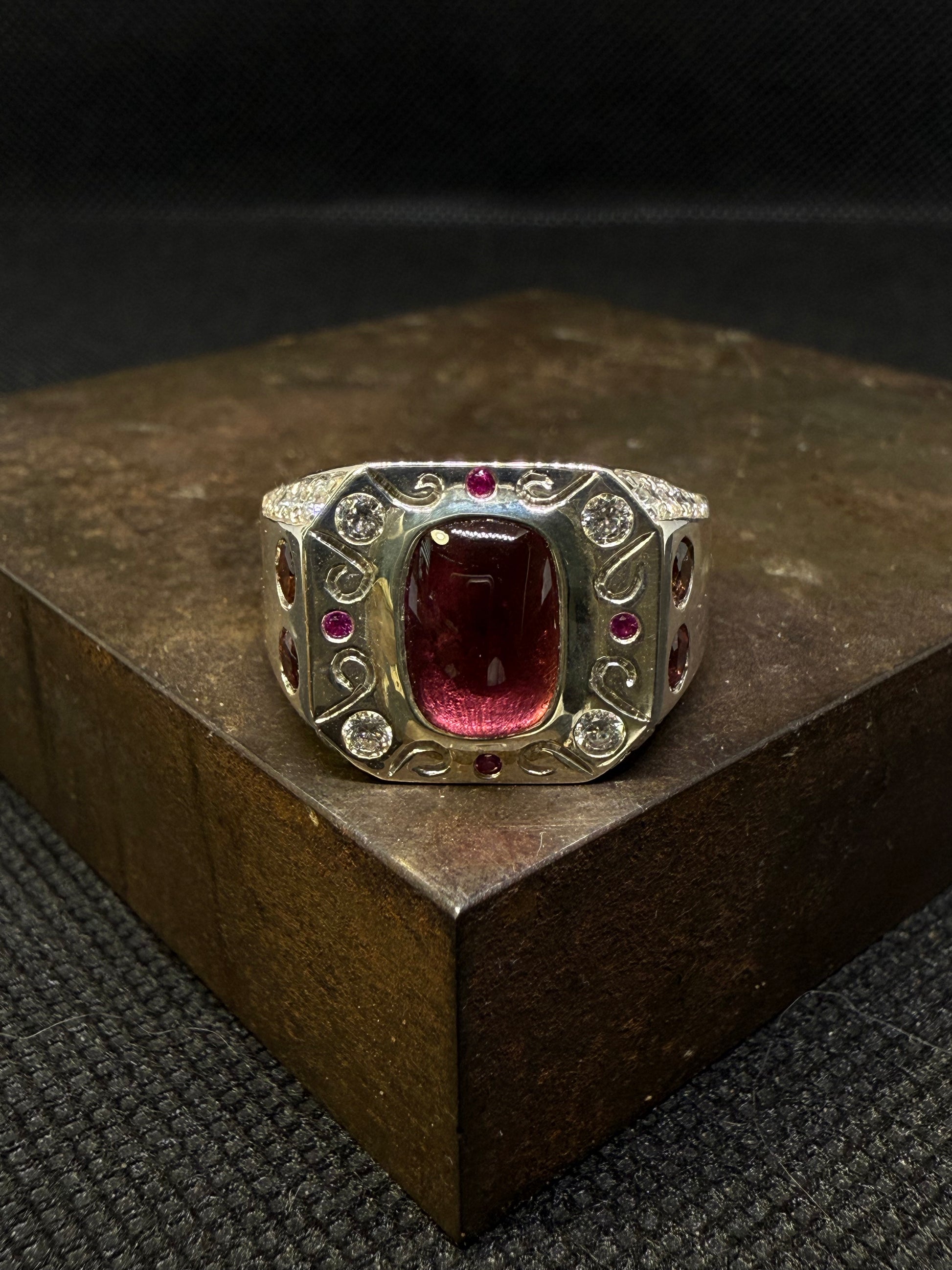 Pièce d’exception, cette bague au design audacieux met à l’honneur une superbe tourmaline rouge en cabochon, au cœur d’une monture en argent massif, finement travailler. La pierre centrale d’un rouge profond et lumineux, est entourée de délicats motifs ciselés et ponctuée de petits éclats de pierre, rouge et blanche, qui reflète la lumière sous tous les angles.