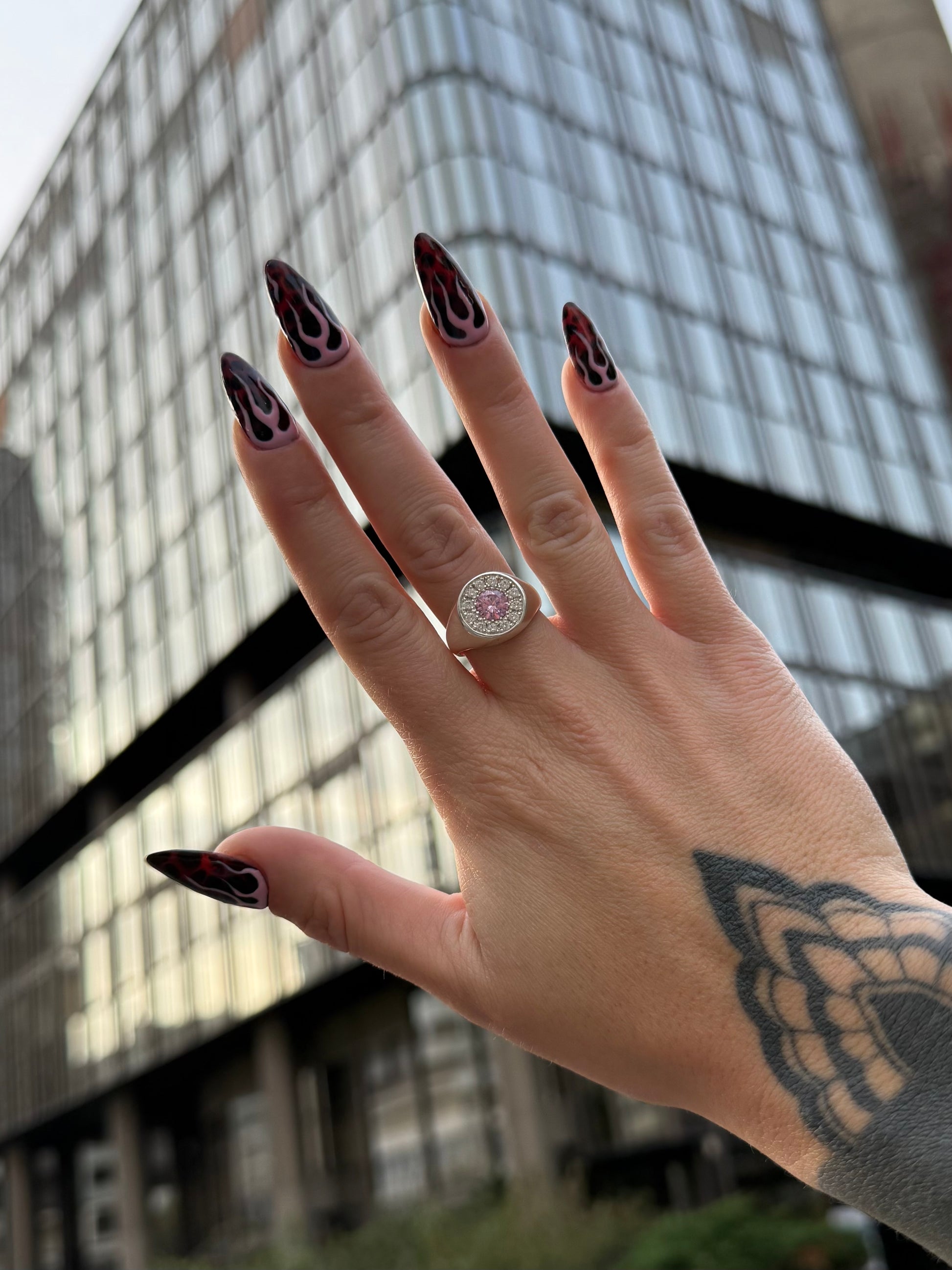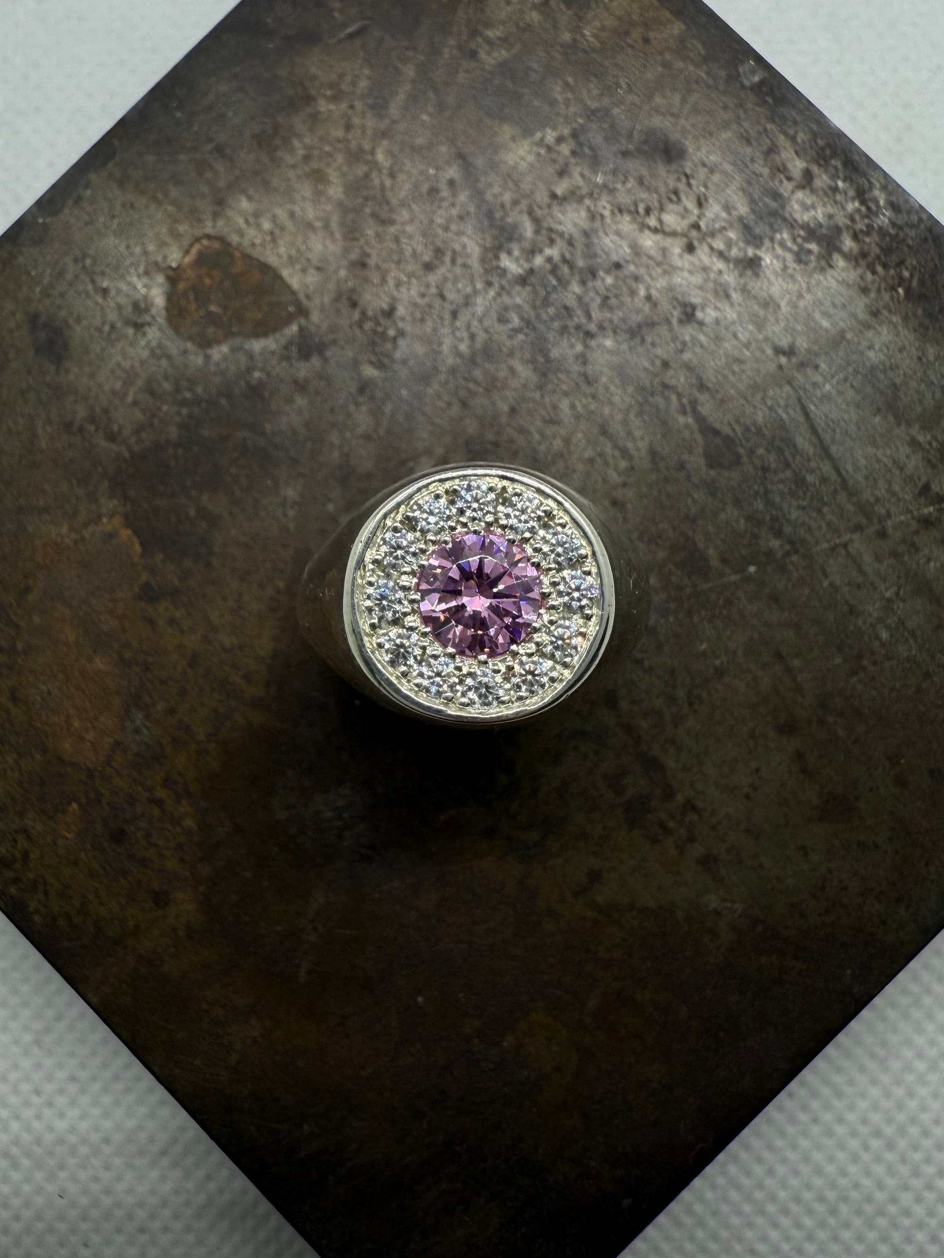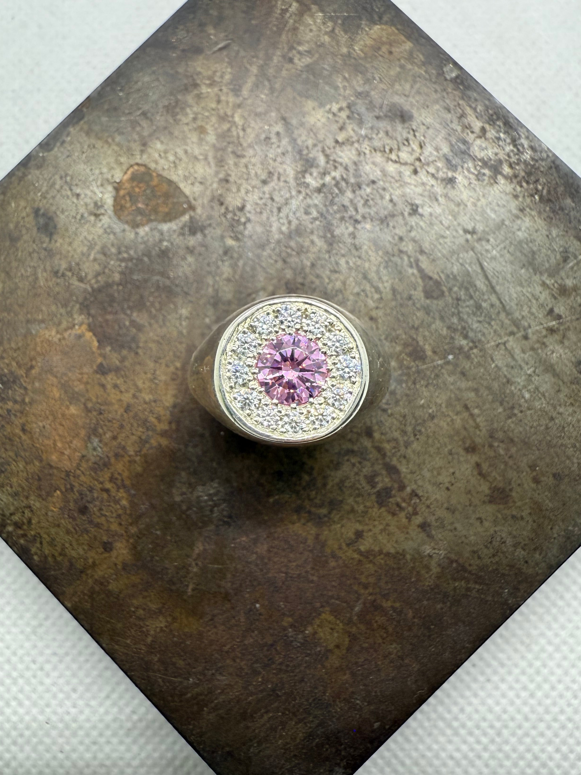 Sublimez votre style avec cette chevalière élégante et moderne, mettant en valeur un somptueux oxyde de zirconium rose au centre. La pierre principale à la teinte lumineuse et apaisante, est sublimée par un entourage d’oxydes de zirconium blancs soigneusement sertis à la main , créant un jeu d’éclat raffiné et intemporel.